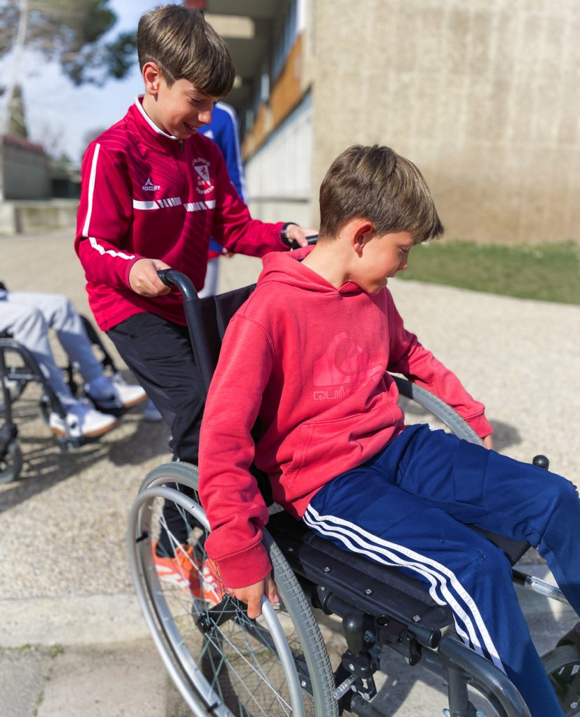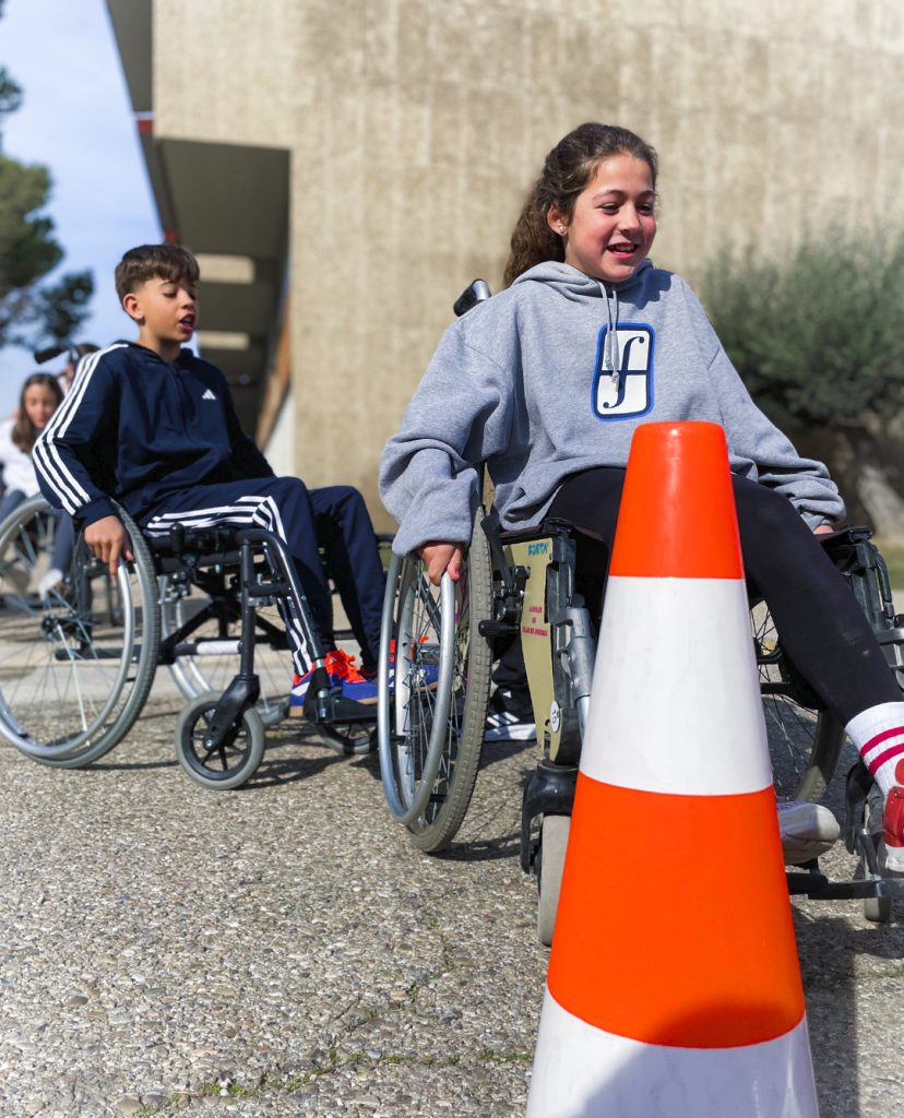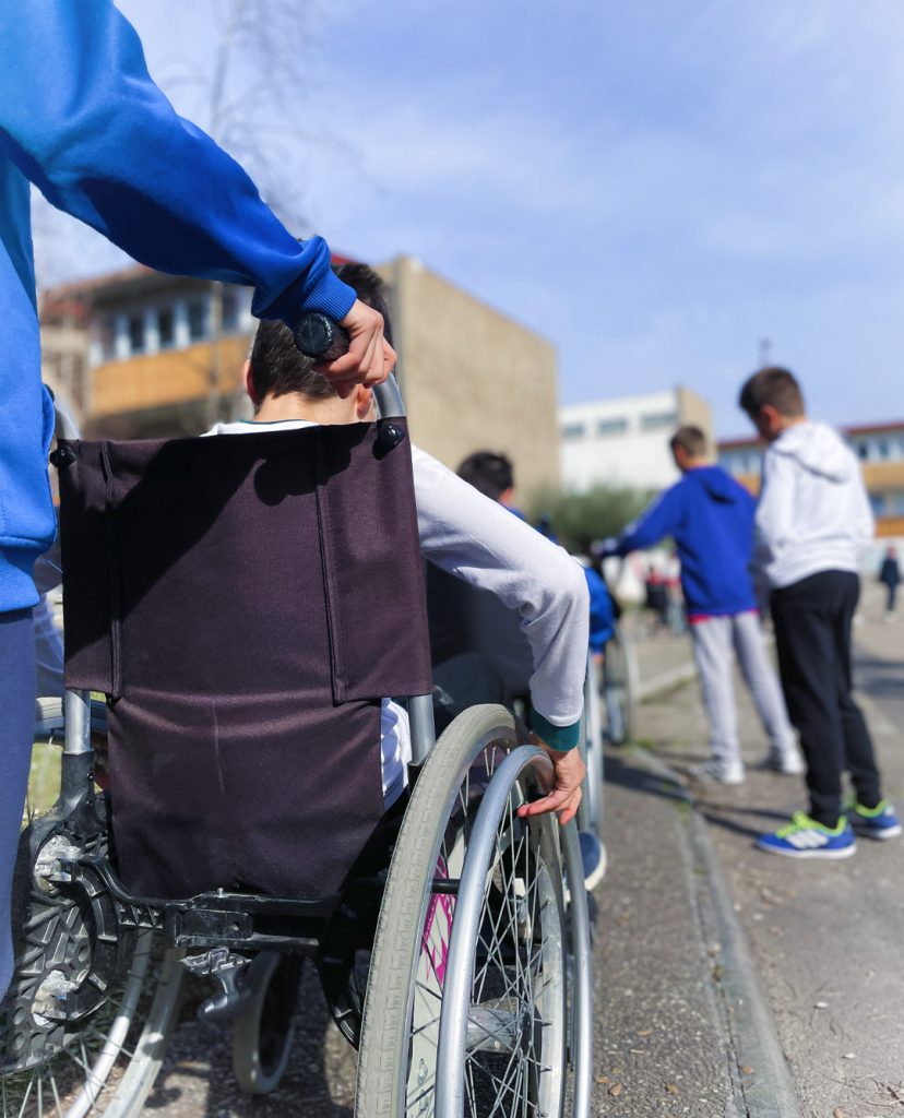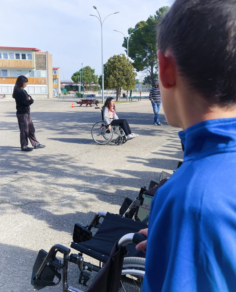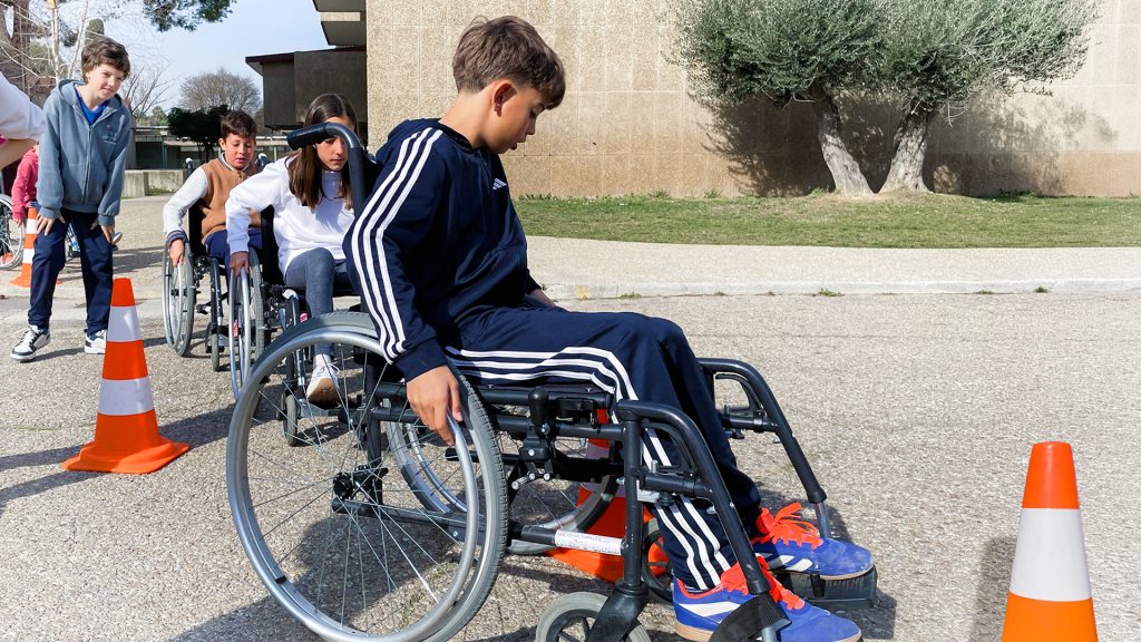 Esta semana hemos tenido una visita que nos ha mostrado otra manera de movernos por el mundo: Fundación DFA ha pasado una mañana con las niñas y niños de 5º de primaria explicándoles cómo el hecho de tener una discapacidad motora no es impedimento para desplazarnos eficazmente por el entorno, eso sí, en silla de ruedas.